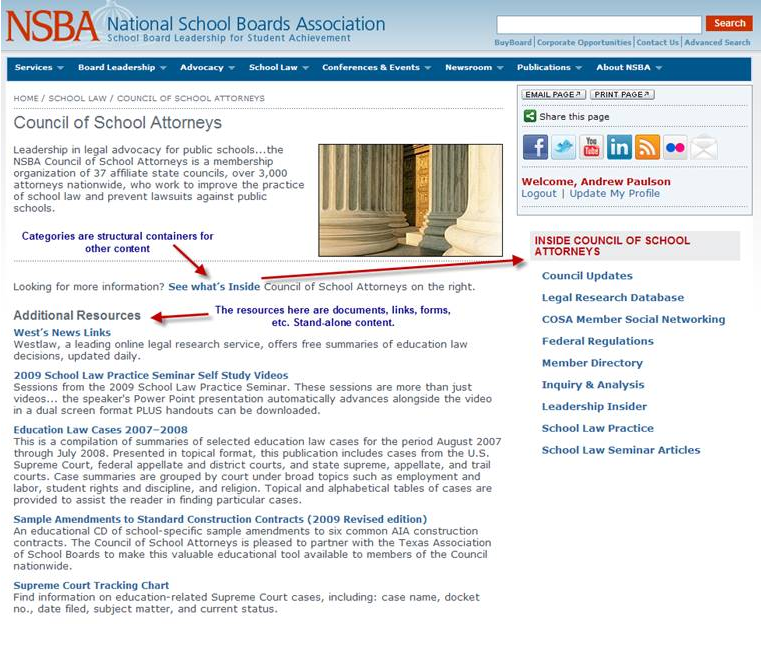 The Council of School Attorneys homepage is a category. This category/folder contains documents, links, and other categories (sub-folders). However, the sub-folders themselves are, again, primarily used to organize more content.